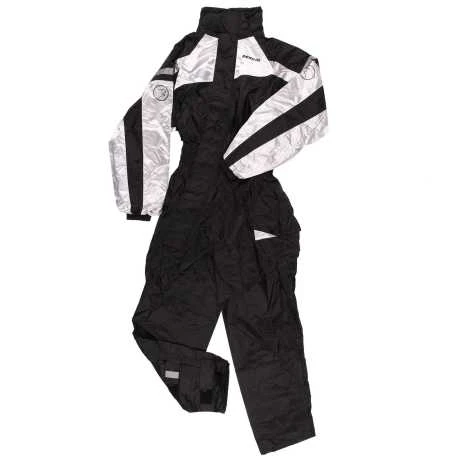 Wasserdichter Regenanzug aus Nylon, mit Beinabschluss, Portemonnaie-Tasche und reflektierendem Panel für bessere Sichtbarkeit. Unverzichtbar auf dem Weg zur Arbeit oder bei einem Ausflug an regnerischen Tagen. Der seitliche Reißverschluss erleichtert das schnelle Umziehen.