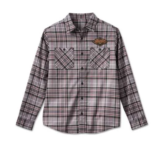 Original Harley-Davidson Herren langarm Hemd aus der limitierten 120th Anniversary Kollektion. Gefertigt aus einer strapazierfähigen Twill-Mischung aus Baumwolle, Polyester und Elastan, die weich gewaschen wurde, damit das Teil als zusätzliche Schicht eine bequeme Wahl ist. Mit einer Stifttasche, einstellbaren Bündchen und einem Kragen, der dank versteckter Druckknöpfe beim Fahren an seinem Platz bleibt. Auf der Vorderseite befindet sich ein spezieller Aufnäher, der unser langjähriges Erbe feiert. Kombiniere dieses Karohemd mit unserer 120th Anniversary Baseball Cap, um unseren Meilenstein gebührend zu würdigen.