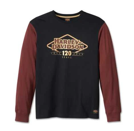 Original Harley-Davidson Herren Longsleeve Shirt aus der limitierten 120th Anniversary Kollektion. Jersey aus reiner Baumwolle bietet ganztägigen Tragekomfort in traditionellem Schnitt und im Slim-Fit-Schnitt. Kontrastierende Ärmel sorgen für einen Farbakzent und die besondere Stilnote, während Rippstrick am Halsausschnitt und an den Bündchen Formbeständigkeit verspricht. Das Branding zu Ehren unseres 120. Jubiläums prangt gemeinsam mit unserem gewebten Etikett auf der Vorderseite.