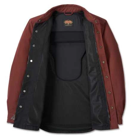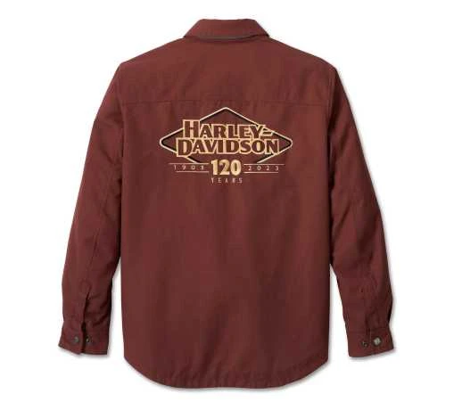 Original Harley-Davidson Herren Riding Hemdjacke (Motorradhemd) aus der limitierten 120th Anniversary Kollektion. Diese Hemdjacke in klassischem Schnitt ist aus einer robusten Twill-Mischung aus Baumwolle und Polyester gefertigt und überzeugt mit funktionalen Details wie Belüftungsöffnungen unter den Achseln, vorgeformten Ärmeln, reflektierender Kragenpaspelierung für erhöhte Sichtbarkeit und einem Kragen, der dank versteckter Druckknöpfe beim Fahren an seinem Platz bleibt. Sie bietet einen unverwechselbaren Look mit unserem speziellen gestickten 120th Anniversary Branding. Für hervorragende Aufpralldämpfung bei gleichzeitiger Atmungsaktivität ist diese Motorrad-Hemdjacke an den Schultern und Ellbogen mit D3O Ghost Protektoren ausgestattet.