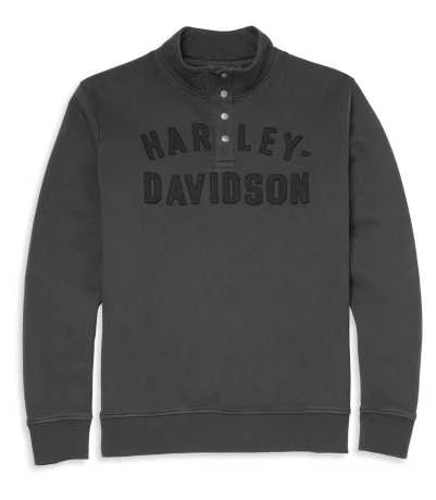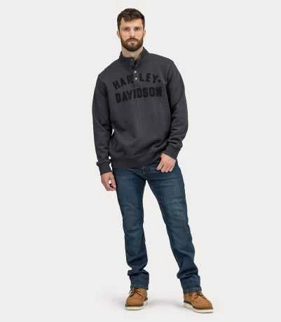 Dieser Mockneck Herren Sweatshirt ist von unserer Vintage-Rennausrüstung inspiriert. Es ist aus strapazierfähigem Baumwoll-Frottee gefertigt und mit schlichten, plakativen Schriftzügen bedruckt. Das leicht gewölbte Design dieses Herrenshirts ist eine Anspielung auf unsere klassische Rennfahreruniform. Eine zierliche Reihe von Druckknöpfen setzt den ultimativen sportlichen Akzent.